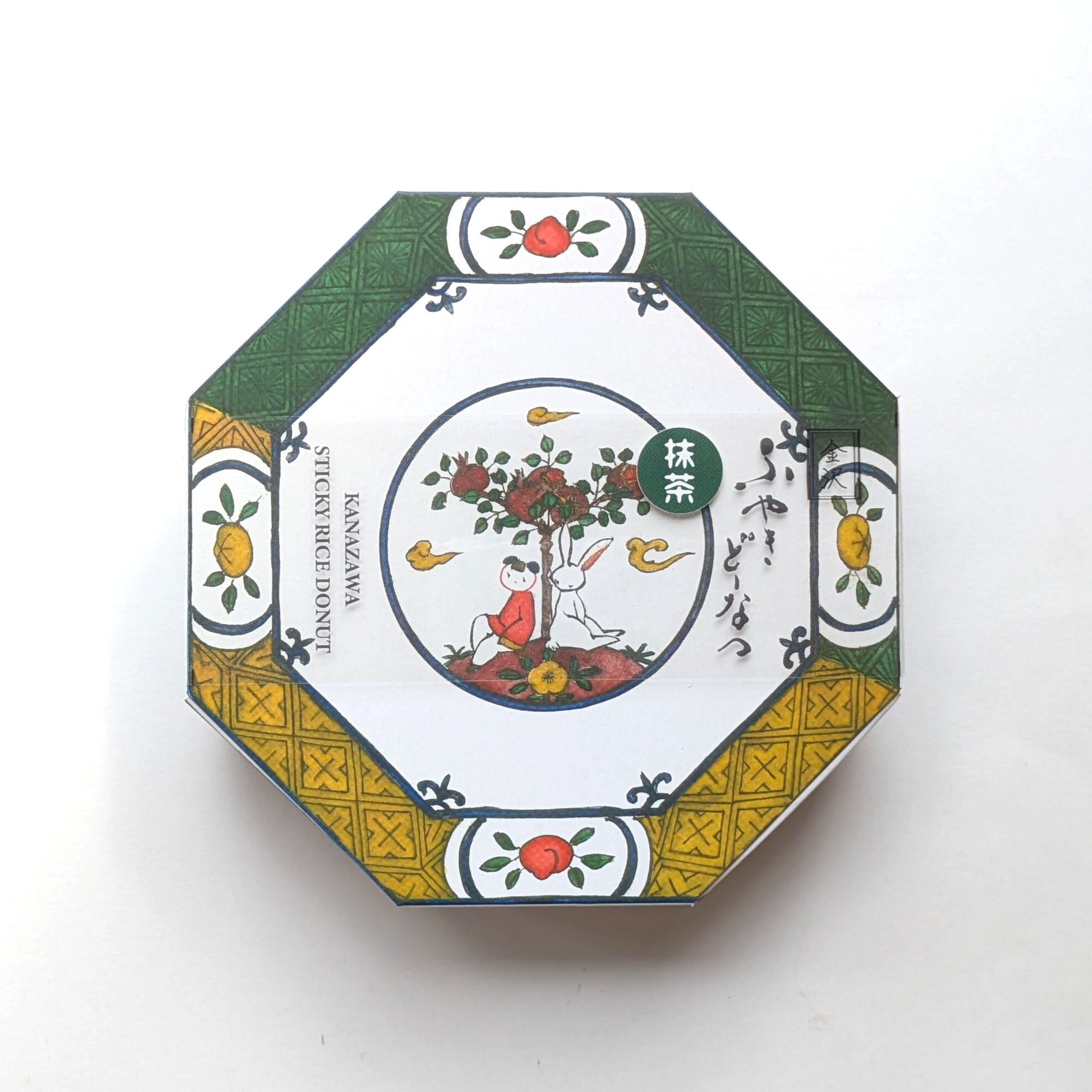 ふやきに抹茶グレーズをコーティングし、ココナッツ、チョコレート、あられをトッピングしました。