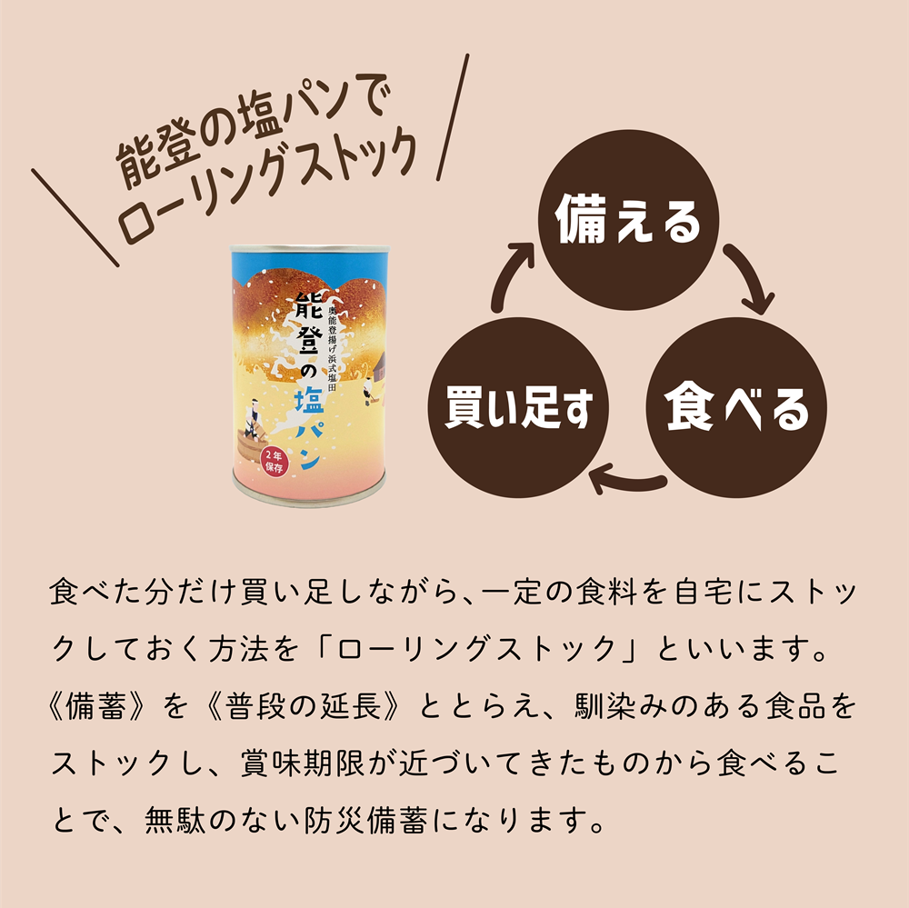 国産の安心安全な缶パンです。ぜひ、ローリングストックでご家庭に常備してくださいね。